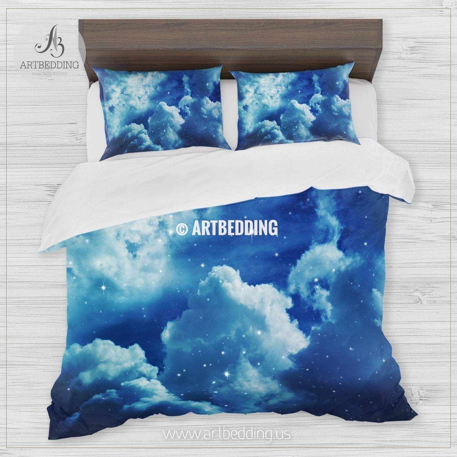 Sky blue clouds bedding, Blue skies with stars Bedding set, White clouds on a blue sky Duvet cover set, Queen / King / Full / TWIN stars Galaxy Duvet Cover, Cotton sateen bedding set, Skies bedding