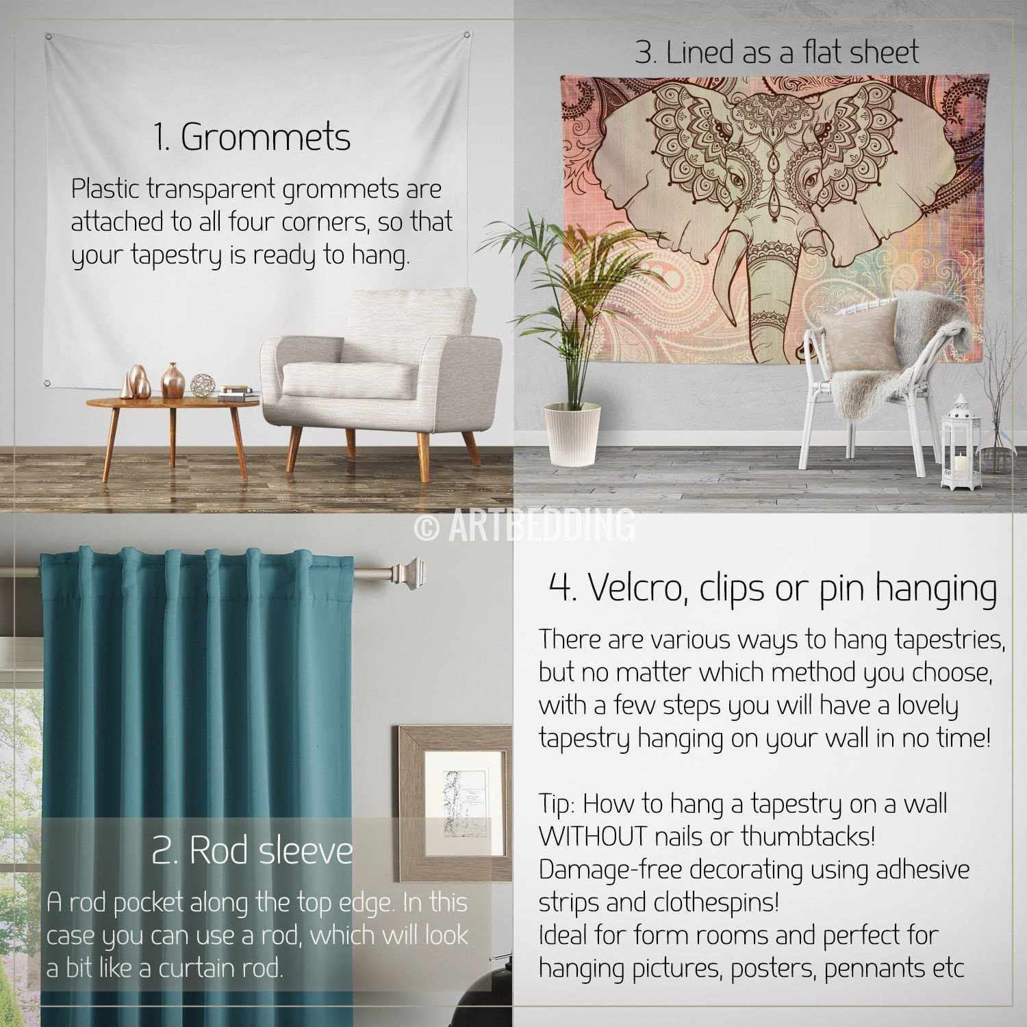 FINISH: There are different ways to hang your tapestry to the wall. The most common are: