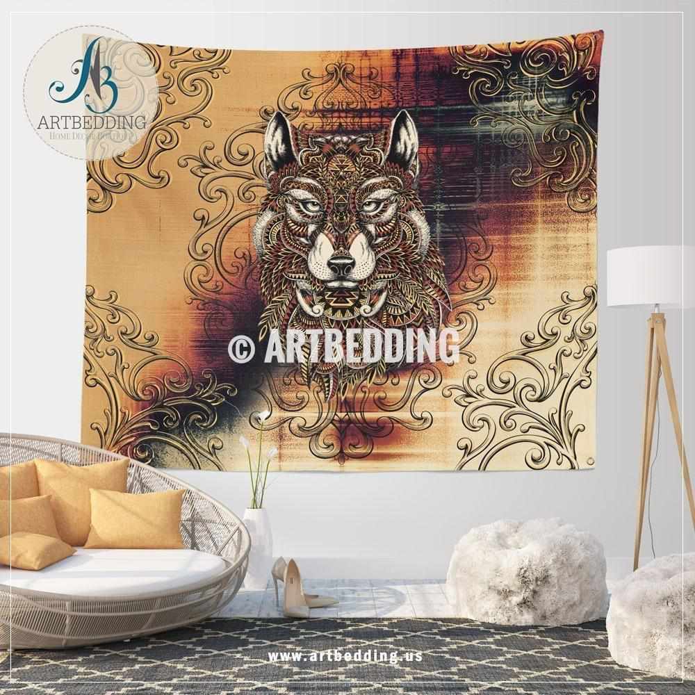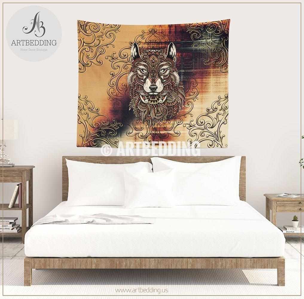 Wolf totem boho wall tapestry, Zentangle Wolf spirit animal wall hanging, Vintage orange Wolf totem wall tapestries