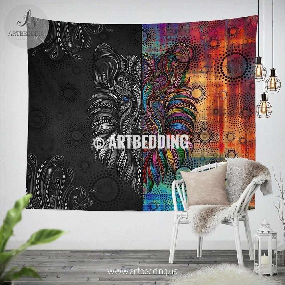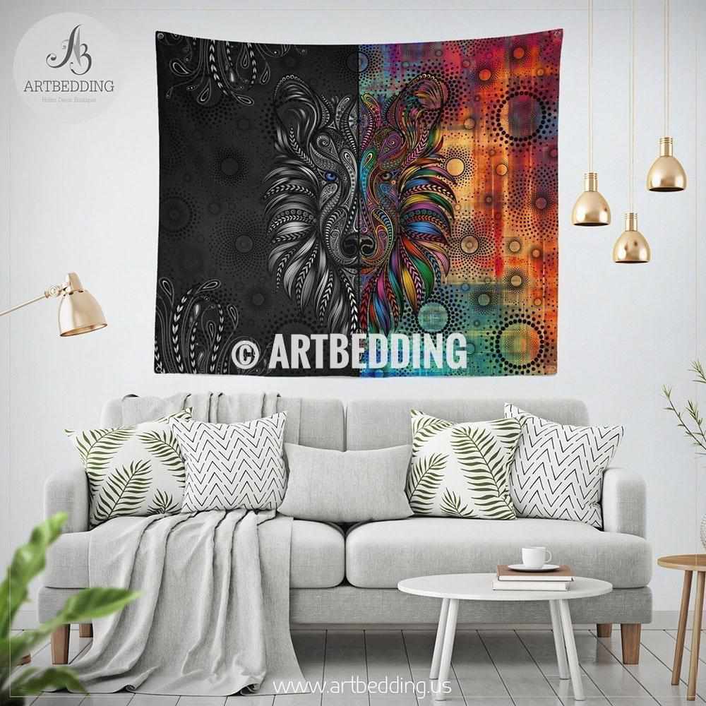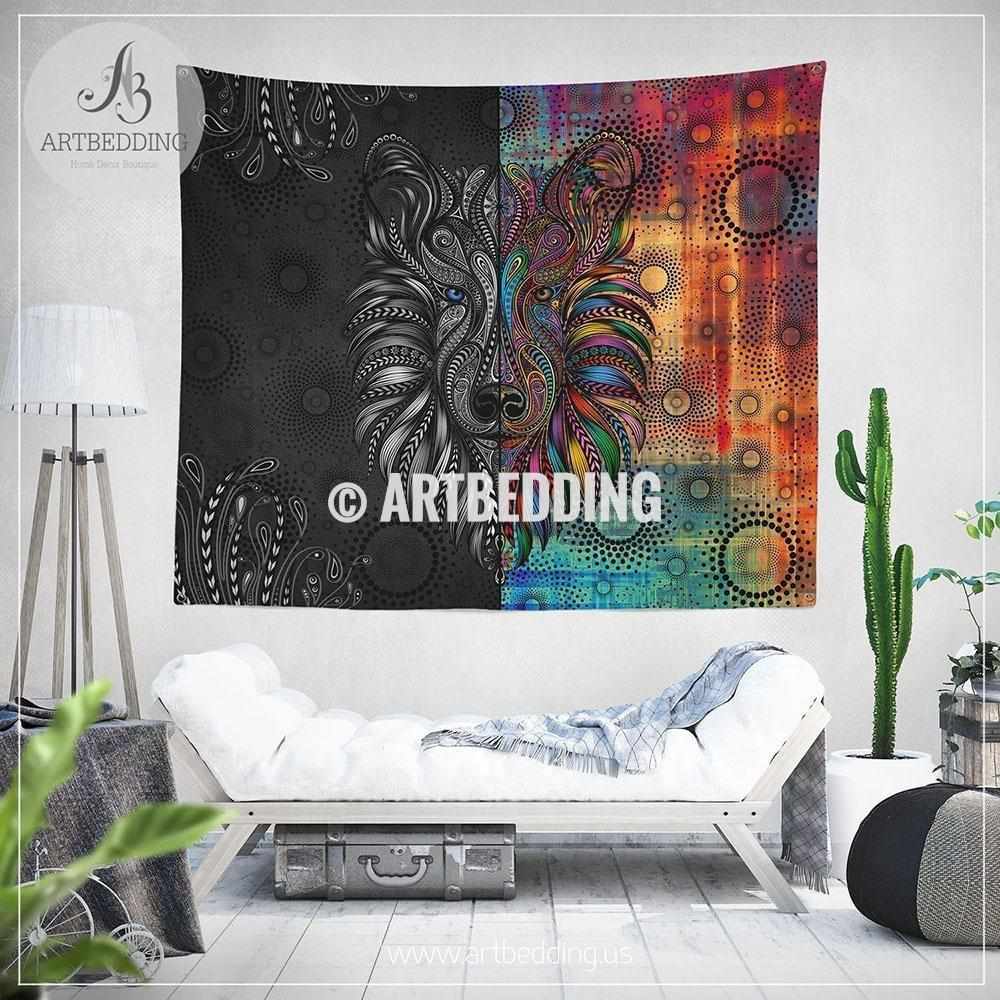 DESIGN: Doodle style vibrant colors wolf totem wall tapestry. Absolutely beautiful doodle art wolf head, representing the idea of white and black wolf, good and bad.