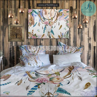 Boho bedding, Watercolor deer skull wildflowers duvet bedding set, Bohemian feather totem bedding, Deer head dreamcatcher duvet cover set, Bohochic bedroom decor, artbedding art