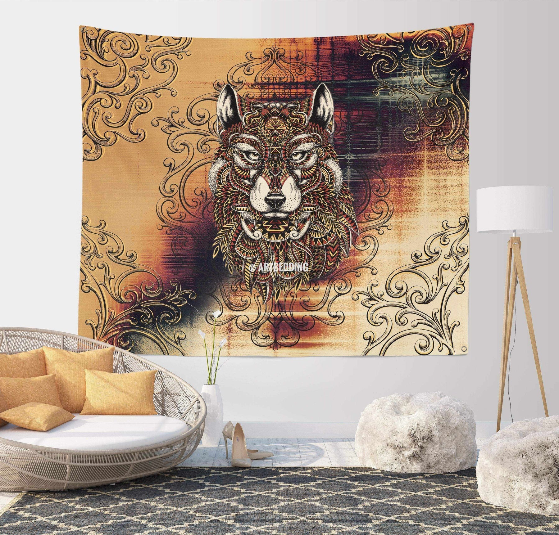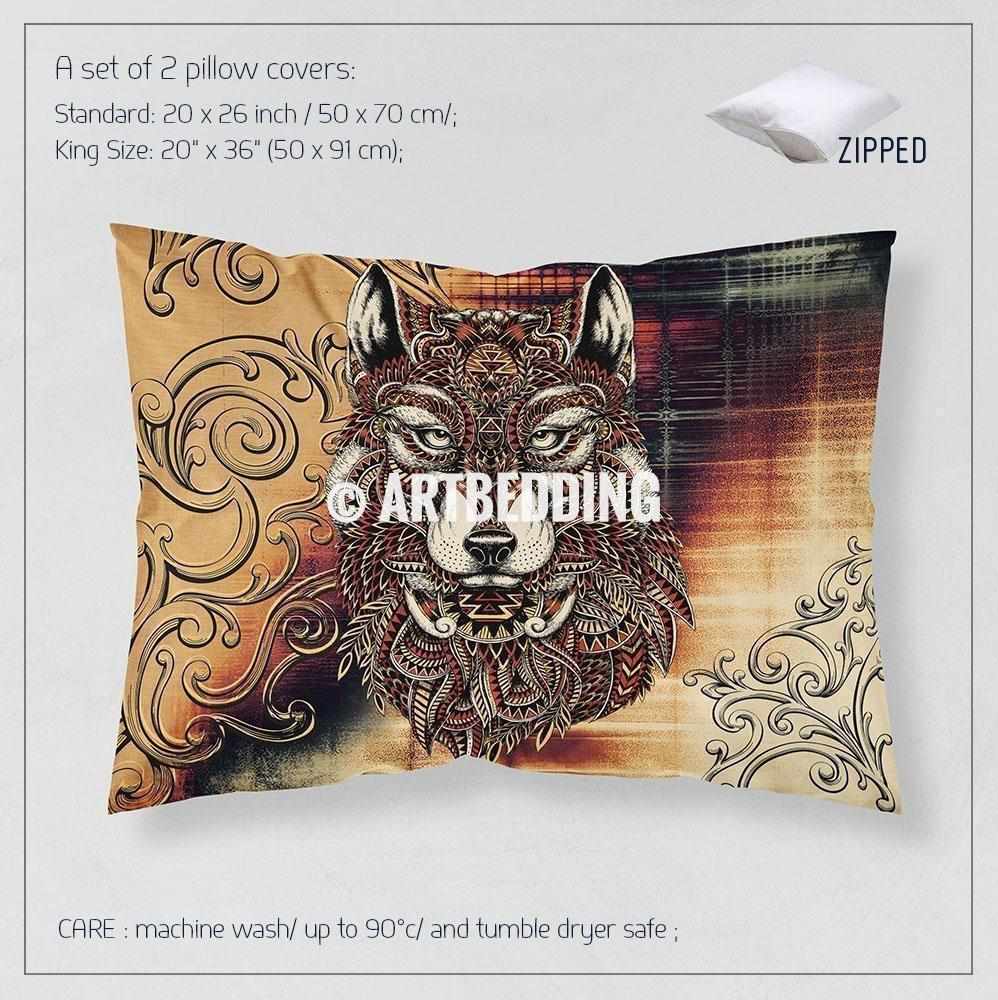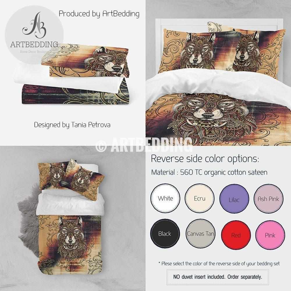 Boho wolf spirit animal bedding, Zentangle vintage orange wolf duvet bedding set, Wolf totem comforter set