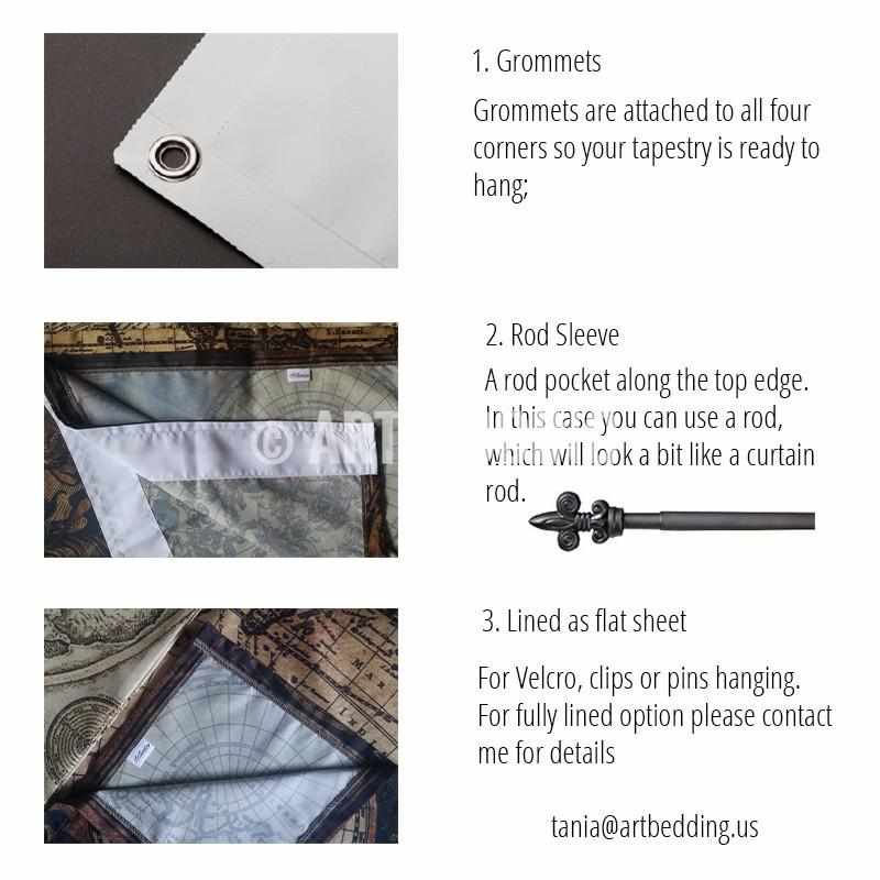 FINISH: There are different ways to hang your tapestry to the wall. You can select one of the 3 most common ones: